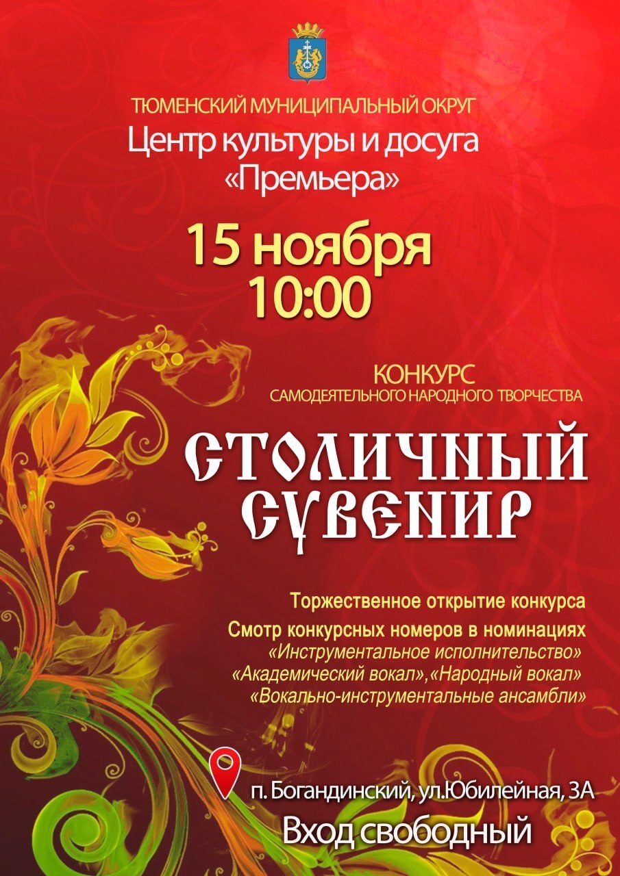 В Тюменском округе стартует конкурс самодеятельного народного творчества «Столичный сувенир». Торжественное открытие и смотр конкурсных номеров пройдет 15 ноября в 10:00 в Центре культуры и досуга «Премьера» п. Богандинский.