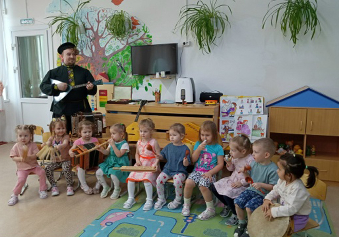 Николай Сергеевич, облаченный в яркий народный костюм, словно сошел со страниц сказки. Он увлек наших ребят в путешествие в мир русской музыки, познакомил детей с удивительными инструментами: показал, как поет калюка (травяная дудочка), рассказал про звонкий бубен, задорную балалайку и голосистую гармошку. А сколько радости вызвали расписные свистульки!