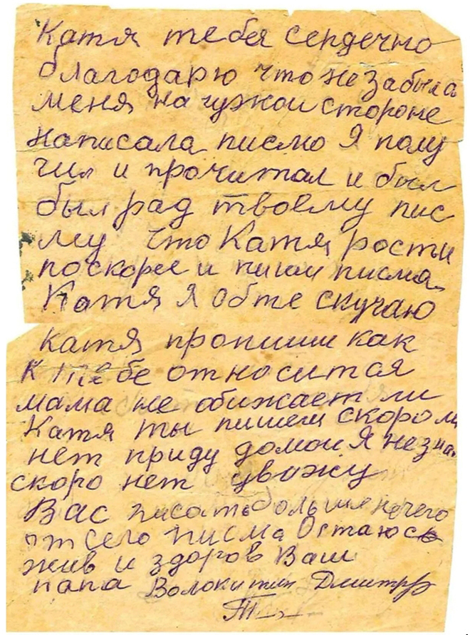 Одно письмо очень дорого маме, так как оно адресовано ей: "Катя, тебя сердечно благодарю, что не забыла меня на чужой стороне, написала письмо. Я получил и прочитал, и был рад твоему письму. Что Катя расти поскорее и пиши писма. Катя я об тебе скучаю. Катя пропиши как к тебе относится мама не обижает ли. Катя, ты пишеш скоро ли нет приду домой. Я не знаю скоро нет увижу Вас. Писать больше нечего. От сего письма остаюсь жив и здоров Ваш папа Волокитин Дмитрий Тимофеевич" (пишу, сохранив орфографию).