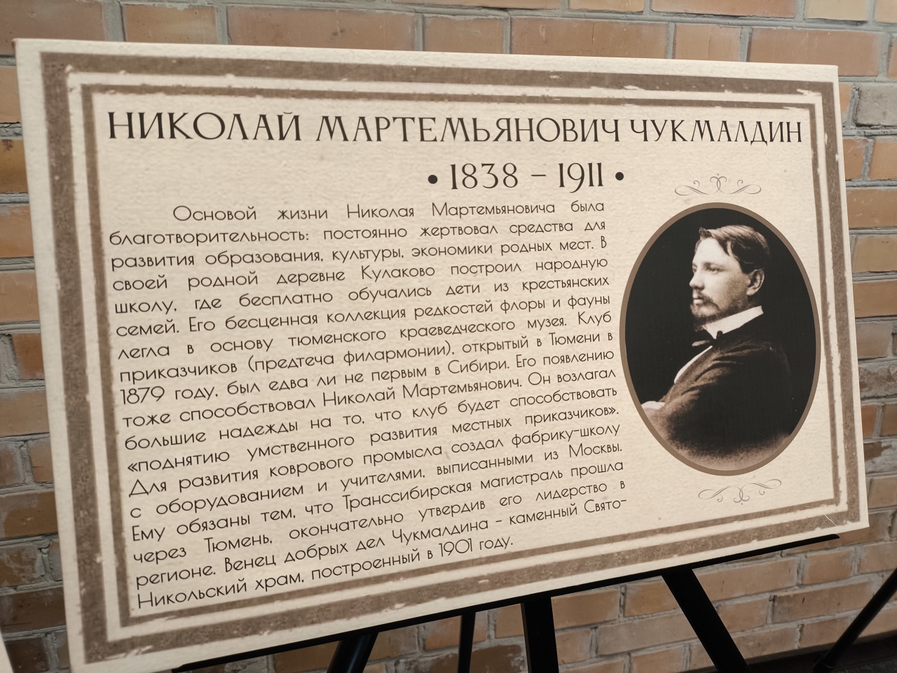 "После семи лет службы Николай стал компаньоном Решетникова. Говоря о тех временах, он не мог вспомнить местного товара, которым бы ни занимался. У него, видимо, была, как сейчас говорят, чуйка на то, что будет приносить прибыль. В итоге Чукмалдин стал купцом 1-й гильдии, его доходы возросли в десятки раз. К благотворительности он подходил столь же трезво и основательно, как и к своему бизнесу. Вообще, главным критерием предпринимательства он называл порядочность и прослыл одним из самых честных тюменских купцов. В своей родной деревне Кулаково Чукмалдин построил народную школу. Здание этой школы очень интересное. Оно многоуровневое – это связано с тем, что мальчики и девочки там учились раздельно, у них были для этого отдельные входы. И была сделана пристройка, где проживал учитель, который в этой школе преподавал. На территории школы был разбит парк, деревья в нем были в основном завозные, которые, как считалось, у нас не произрастали. Аллеи его были спланированы по европейскому образцу. У пруда находилась березовая аллея, центральная – была липовая, кольцевая – еловая, змейка – лиственничная. За каждое прижившееся дерево Чукмалдин выплачивал крестьянам по рублю. Николай Мартемьянович не только построил здание школы, но и продолжал ее длительное время содержать: выделял деньги на страхование, освещение, сторожа, жалование помощнице учителя, содержание пришкольного парка", – рассказала Лариса Петровна.