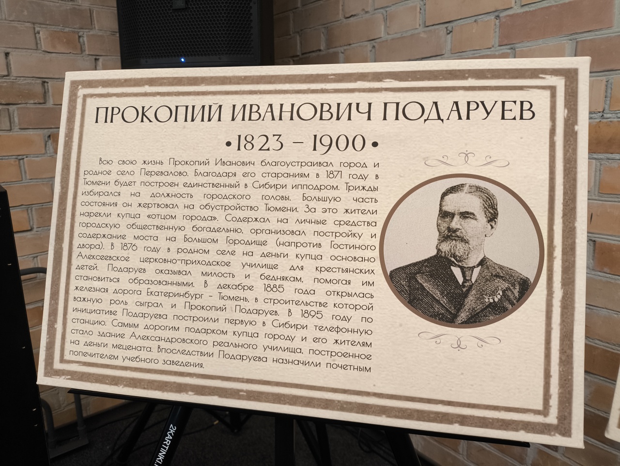 "Один из главных купцов, усилиями и капиталами которого город получил такое прекрасное профессиональное учебное заведение, как реальное училище, был Прокопий Иванович Подаруев. Он трижды избирался городским головой Тюмени, отличался благотворительностью, был председателем многих благотворительных обществ. Еще и в своем родном Перевалово он построил Алексеевское сельское училище", – отметил Сергей Алексеевич.