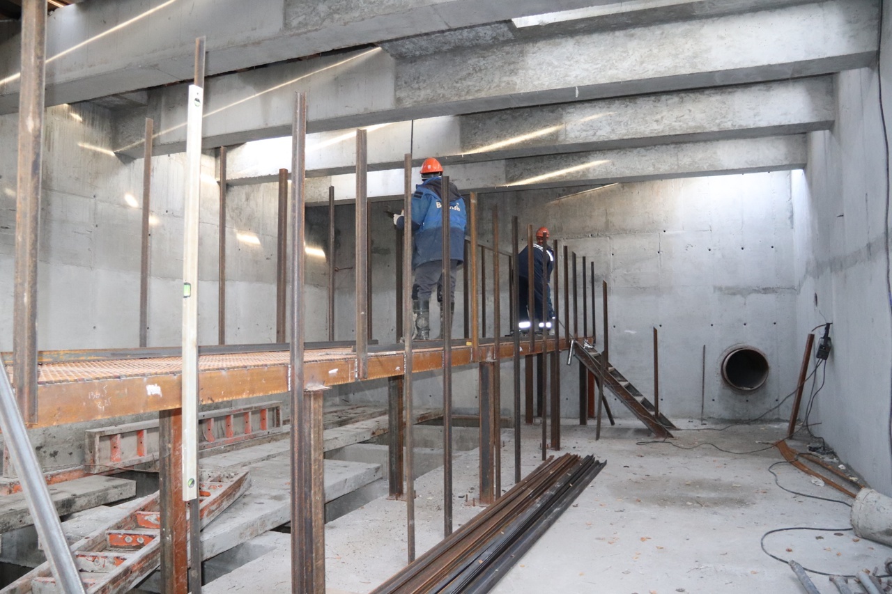 Уже завершили самый сложный этап — монолитные работы. Под землёй, на глубине 13 метров, готова прочная бетонная конструкция высотой с пятиэтажный дом. Она разделена на два блока: в одном будет приёмное отделение, в другом — всё технологическое оборудование.