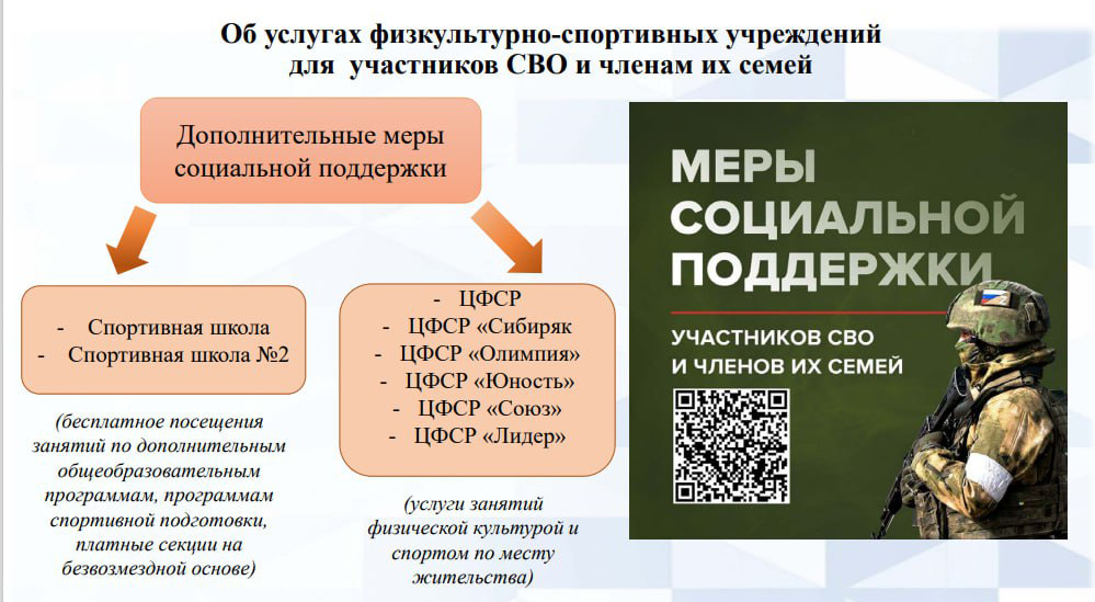 Об оказании физкультурно-спортивных услуг рассказал замначальника управления по спорту и молодежной политике округа Андрей Зобнинский. Возможность бесплатно заниматься в секциях спортивных школ, посещать занятия в Центрах физкультурной и спортивной работы предоставлена всем участникам и ветеранам СВО (за год ею воспользовались более 100 человек), их детям и супругам (более 170 человек).