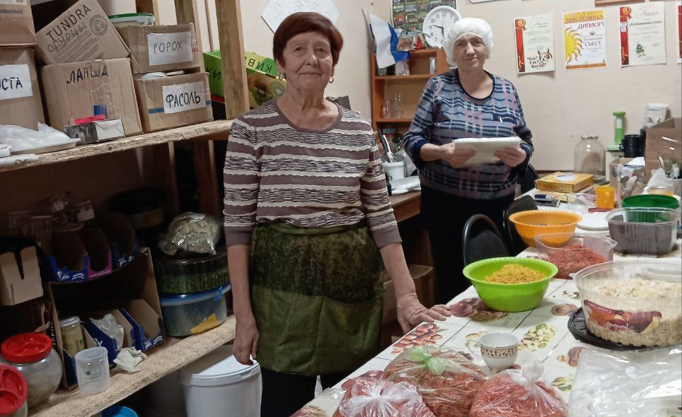 Женщины из группы плетут сети, сушат и фасуют супы, травяной чай и витаминные напитки, шьют белье, вяжут носки и многое другое.