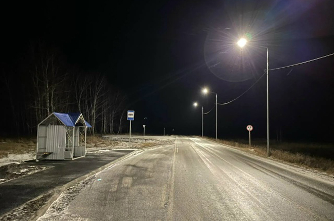В Тюменском муниципальном округе одним из таких объектов стал остановочный пункт "Подушкино" дороги Тюмень-Каменка - граница Свердловской области: здесь установлены фонари.