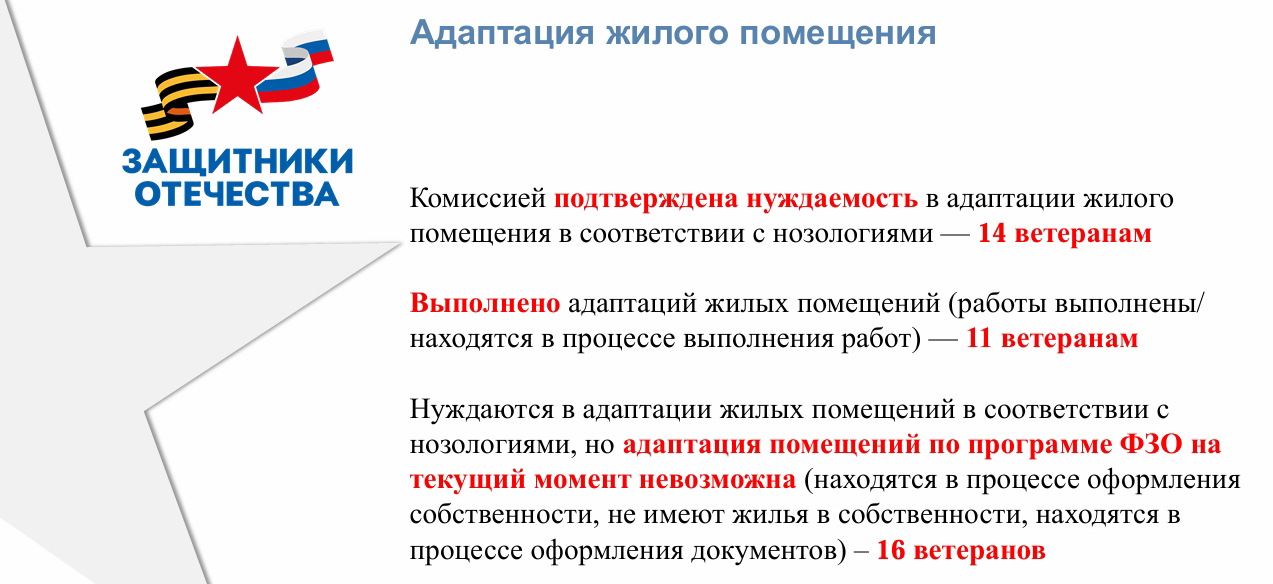 Представитель филиала Фонда "Защитники Отечества" Анастасия Тимофеева рассказала об адаптации жилых помещений для ветеранов СВО с инвалидностью. В Тюмени и Тюменском округе в этом нуждаются 30 ветеранов. Тема непростая, решение этой проблемы сопряжено с немалыми трудностями, и тем не менее для 11 человек необходимая адаптация жилья выполнена.
