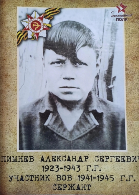 Александр Сергеевич Пимнев – мой прадед по маминой линии. Родился в 1923 году. Участник ВОВ. Сержант. Воинская часть: 556-й стрелковый полк 169-й стрелковой дивизии. Убит полицаем-бандеровцем, когда их передовой отряд осматривал хутор на наличие немцев. 27 ноября 1943 года А.С. Пимнев заглянул в погреб в одном из домов, а прятавшийся там полицай выстрелил в него. Прадед был похоронен в деревне Добрич в Кормянском районе Гомельской области Республики Беларусь.