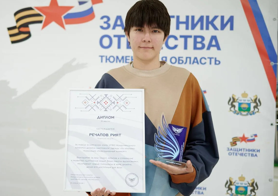 Студент Тюменского техникума индустрии питания, коммерции и сервиса Рият Речапов стал призером конкурса дизайна адаптивной одежды "На крыльях", который прошел в рамках "Кубка Защитников Отечества" в Екатеринбурге. В номинации "Повседневный комфорт" он занял третье место.